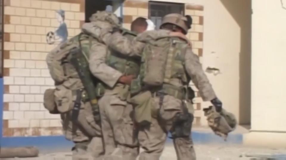 USMC Capt. Nathan Frame, Marine Medium Tiltrotor Squadron 364, and U.S. Navy Corpsman Hospitalman 1st Class Mark Skaggs, Marine Aircraft