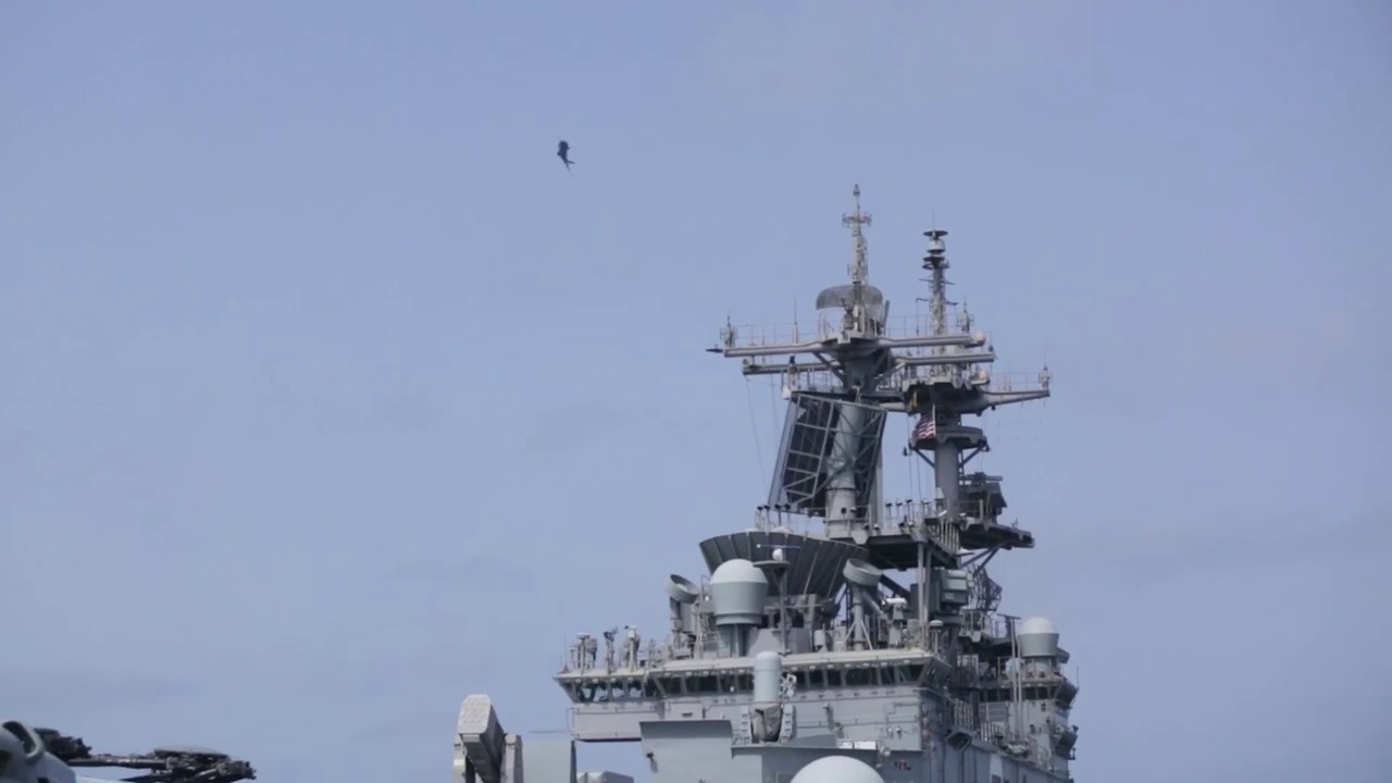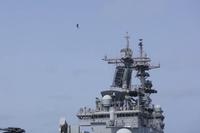 An AV-8B Harrier lands and takes off from the flight deck of the Wasp-class amphibious assault ship USS Kearsarge (LHD