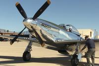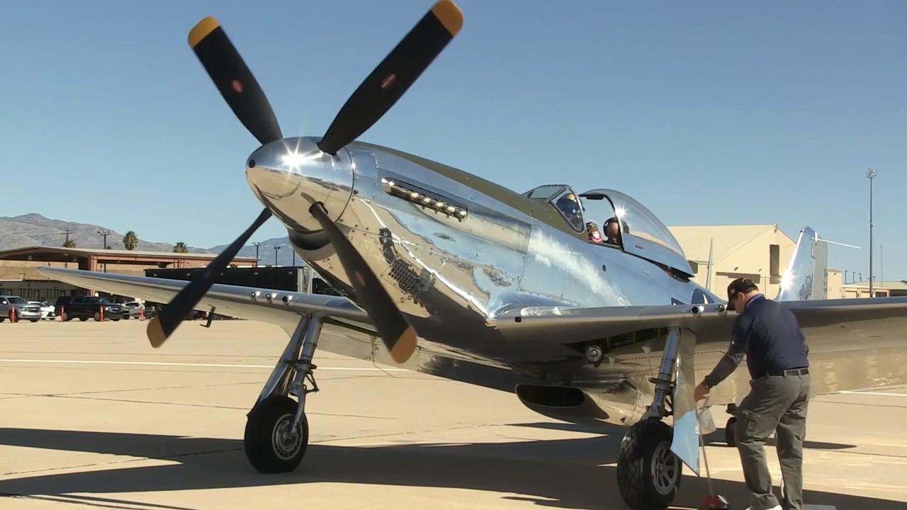 Two P-51s and an F-22 fly together on the first day of Heritage Flight at Davis-Monthan AFB in Tucson, Arizona