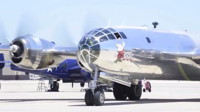 A restored WWII era Boeing B-29 Superfortress, nicknamed "Doc", takes off from McConnell Air Force Base, Kansas and arrives at
