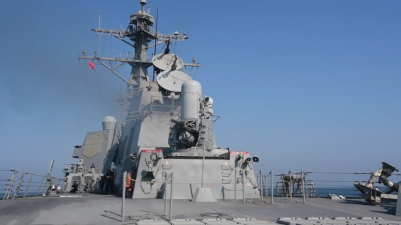 The Arleigh Burke-class guided-missile destroyer USS Ralph Johnson (DDG 114) conducts a live fire exercise in the Arabian Gulf, Sept