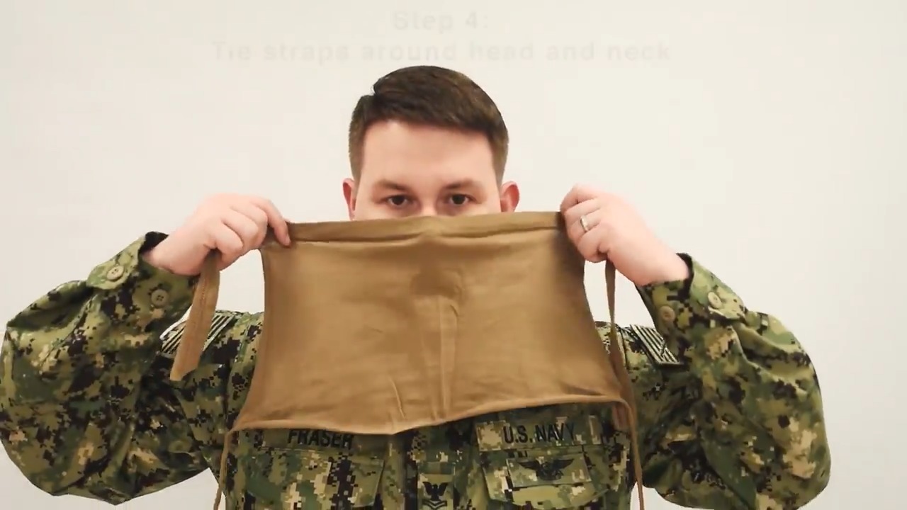 Mass Communication Specialist 2nd Class Tyler Fraser demonstrates do it yourself facemask options per Centers for Disease Control and Prevention