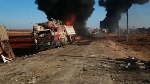 Drone footage as well as footage on the ground shows a convoy of ISIS vehicles completely destroyed by a Russian