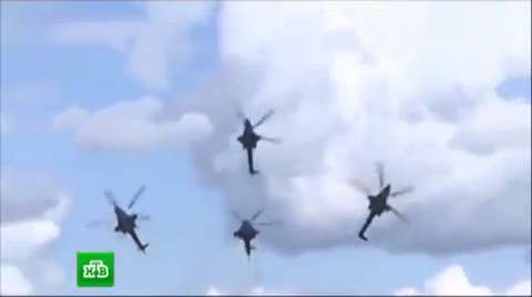 An Mi-28 Russian military helicopter falls from the sky while performing aerobatic maneuvers at an air show in the Ryazan