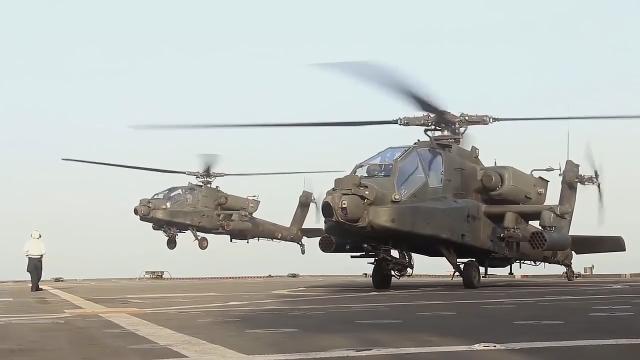 U.S. Army AH-64 Apache helicopters from 3rd Squadron, 6th Cavalry Regiment, 40th Combat Aviation Brigade land on the USS Ponce