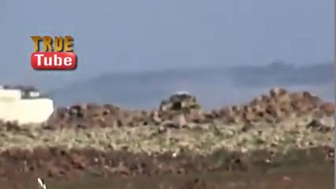 30 MAR 2015 - Militants engaging Syrian regime forces using a tank are nearly taken out by an incoming round