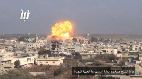 A martyrdom operation caught on tape by Islamic militants targeting a military housing complex in Dara, Syria. 12/07/2014.