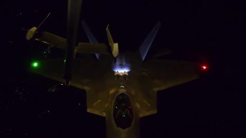 F-22 Raptor at an undisclosed location in Southwest Asia supporting air strikes in Syria recieving fuel on September 27, 2014.