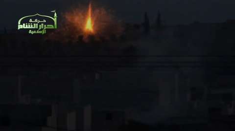 The Syrian rebel Brigade 80 engage a building in Aleppo containing Syrian regime troops with large mortar rounds. 11/18/2013.