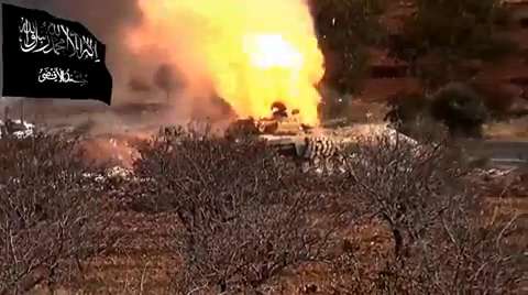 A Syrian Arab Army T-72 tank quickly becomes a ball of fire after getting hit by a rebel antitank missile