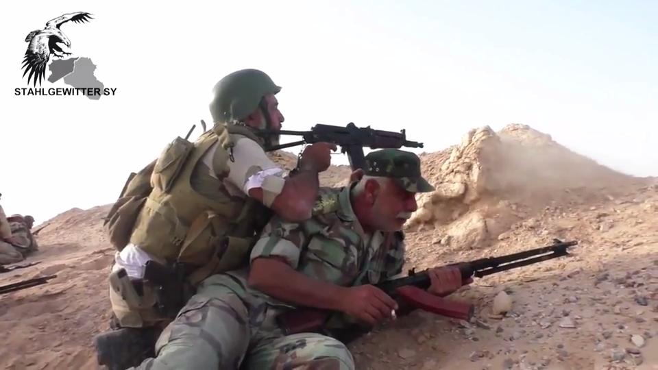 Close air support for Syrian government forces by Mi-24 gunships in eastern Syria. Firefight between Syrian soldiers and entrenched terrorists.