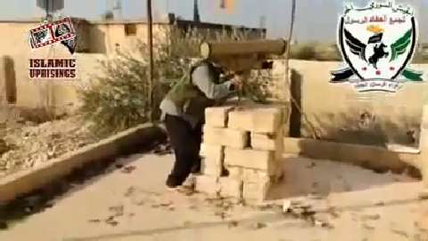 An FSA fighter targets and fires an ATGM on a Syrian Army position in Hich, Syria. Looks like a close