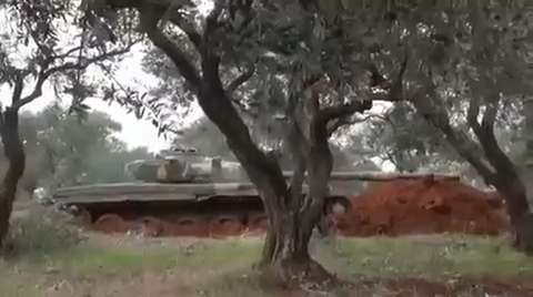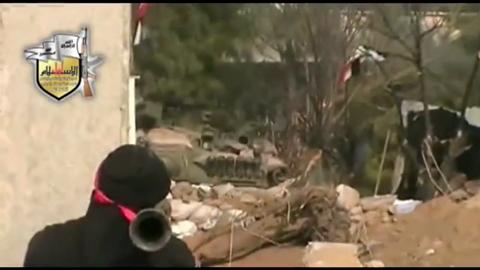 An FSA soldier blows up an SAA T-72 tank with an RPG.