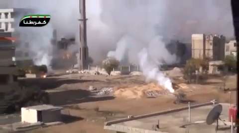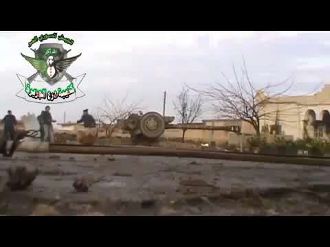 Source: FSA mercenaries firing a 120mm artillery piece at Al Safira Military Base in Aleppo. 12/18/2012.