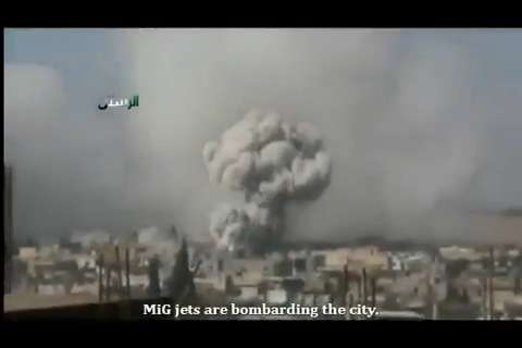 Syrian MiG fighters bomb Homs City on 10/15/2012. Ar Rastan under intense bombardment.