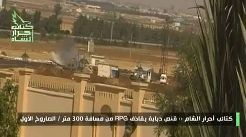 Rebels attack a Syrian army base with RPG's hitting a tank twice from 300meters. 9/29/12 Idlib.