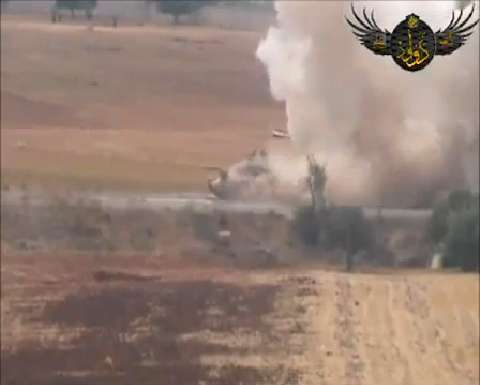 A Syrian Army tank gets hit by two IEDs in Idlib. Watch the wheels roll off on it after contact
