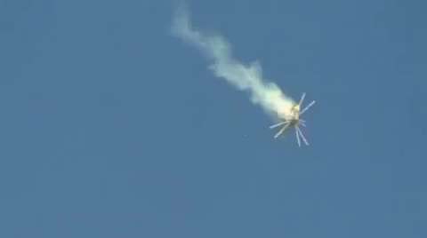 A Syrian Army helicopter gets hit and goes down fast. 10/5/2012.