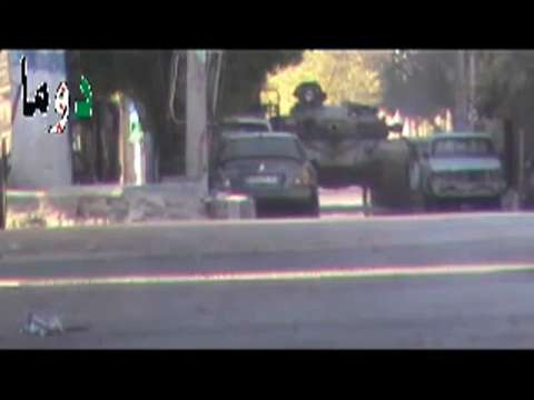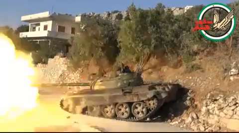Rebels group Sham Falcons attack a Syrian army position with a captured tank in Idlib. 8-28-12.