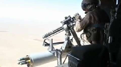 A US Marine UH-1Y Venom Door Gunner fires at insurgents in Helmand province, Afghanistan on October 17th, 2012 towards the