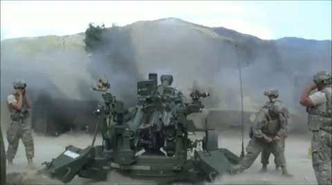 321st Field Artillery engage Taliban fighters on a hillside using the M777 in direct fire mode.